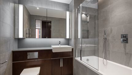 A fully fitted kitchen with integrated AEG appliances complements the spacious living area, which opens onto a private balcony with far-reaching London views. The master suite features a walk-in wardrobe, an en-suite bathroom with bespoke mirrored units and demisting technology, and its own private balcony.