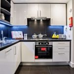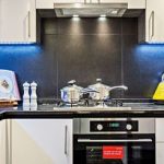 A separate high-spec kitchen comes fully equipped with integrated appliances, LED under-cabinet mood lighting, a full-sized fridge/freezer, electric oven with gas hob, microwave, dishwasher, washer/dryer, and food waste disposal. Both bedrooms are generously sized, with plush furnishings, mirrored fitted wardrobes, and luxury finishes.