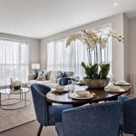 The bright and spacious open-plan living area features floor-to-ceiling windows that flood the space with natural light, leading to a private balcony with striking views of the River Thames and London’s iconic skyline.